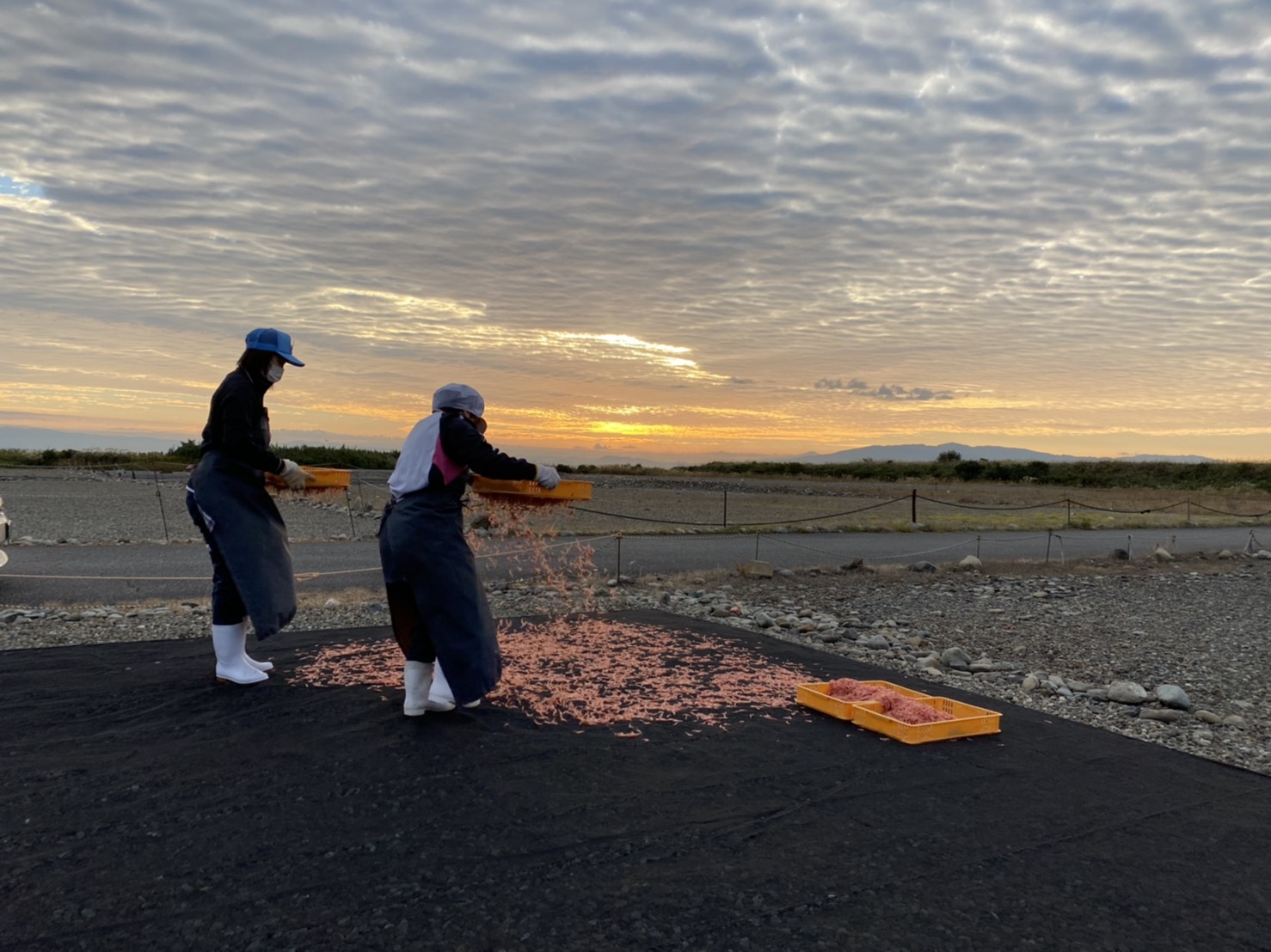 市場から直送し、干し場へ。日の出から作業開始です。