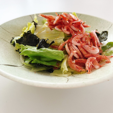 ボウルにレタス、海苔、桜えびを入れて、塩とごま油を入れ混ぜる