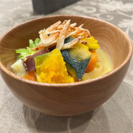 野菜がやわらかくなったら、ねぎ、味噌を入れ溶かして、桜えびを加える