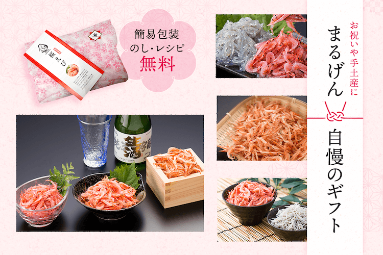 お祝いごとのお返しには、紅白で縁起が良い、桜えび、しらすの詰め合わせがおすすめです。ピンクの包装布、メッセージシールに対応しています。