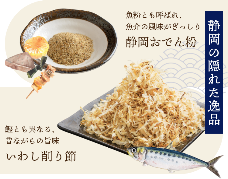 静岡ならではの隠れた名物「いわし削り節」「静岡おでん粉」。桜えびやしらすを主に取り扱っているまるげんですが、実は始まりは「いわし削り節」でした。昔ながらの地元の味を皆さんにお届けしたくて、70年以上経った今でも受け継ぎ大事にお作りしています。